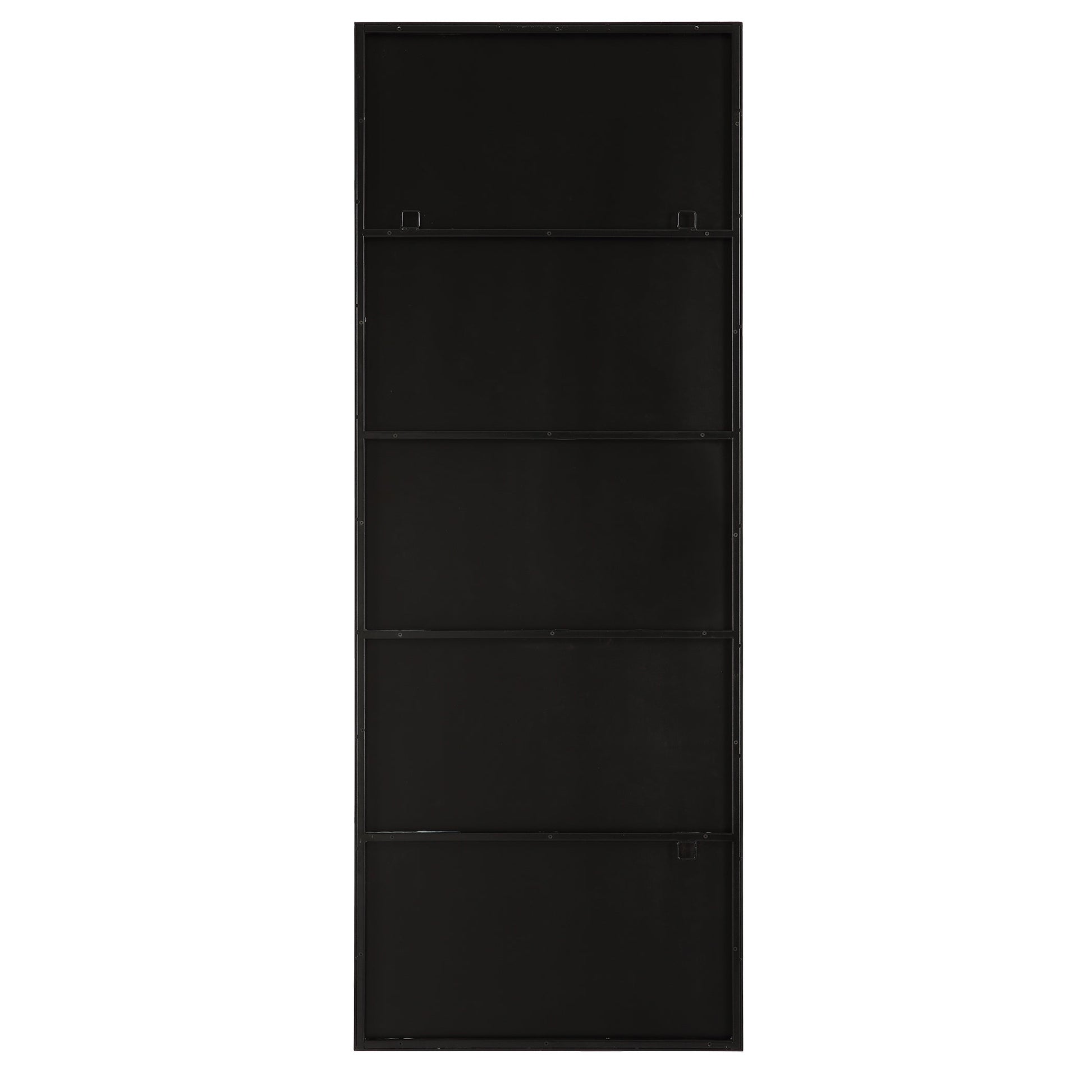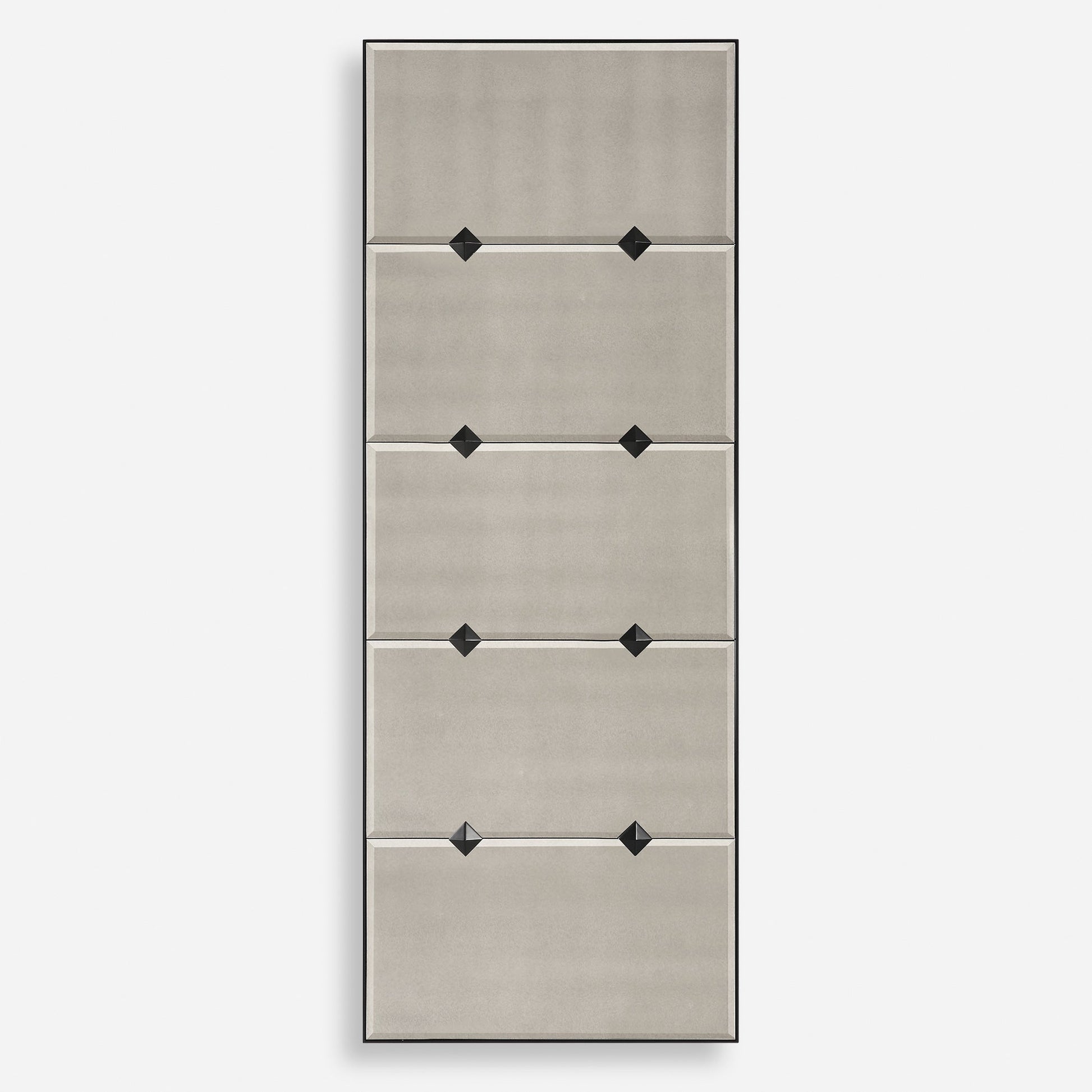 This oversized mirror features antique style mirrors with a petite bevel for an updated traditional appeal surrounded by a slim black iron frame accented with matching metal studded medallions. May be hung horizontal or vertical.Item Dimension (cm ) :