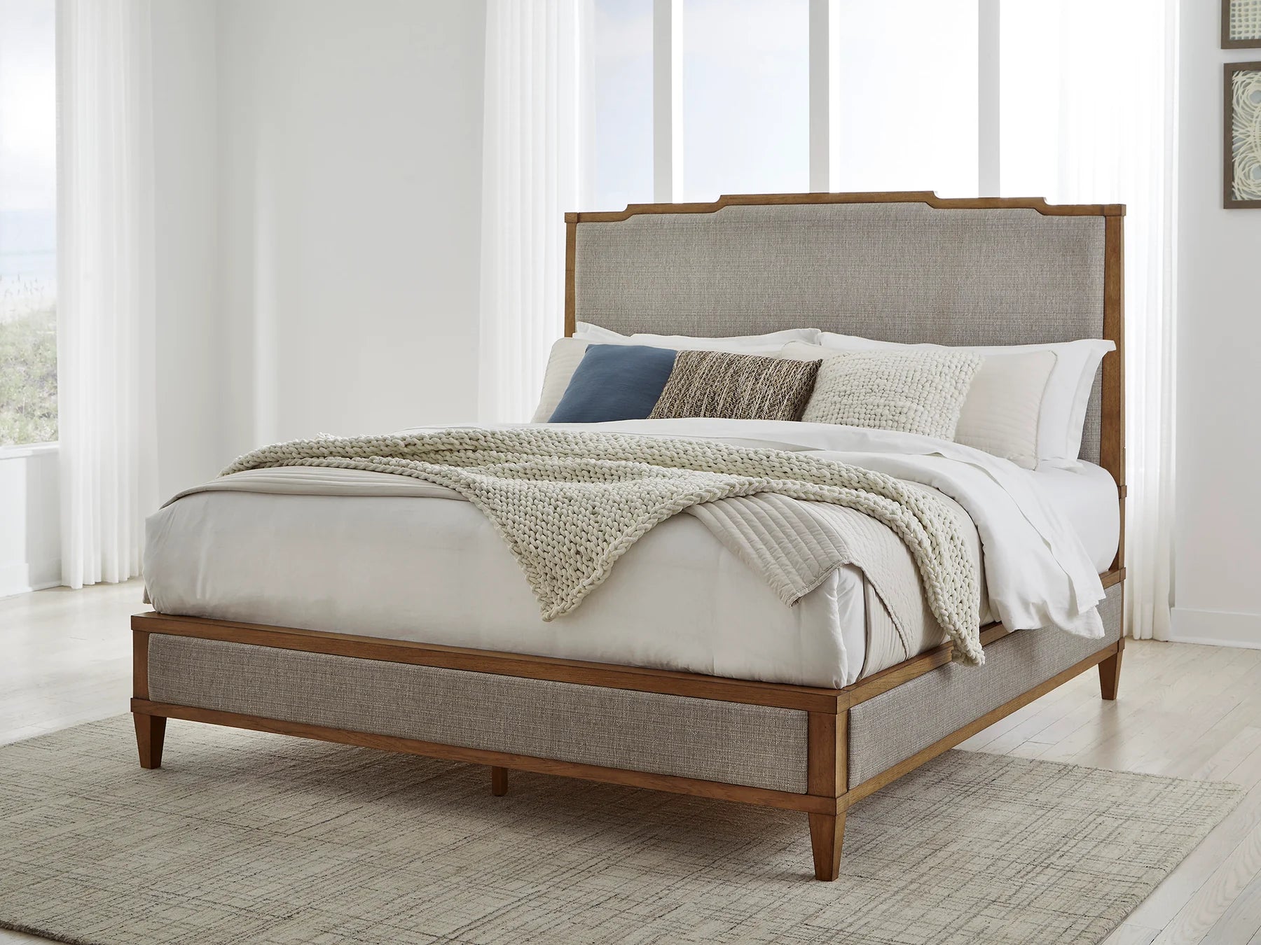 This California king upholstered panel footboard, rails and slats set is made with solid wood, upholstered foam cushions and engineered wood slats. Pairs with other items in the series to make a bed kit.