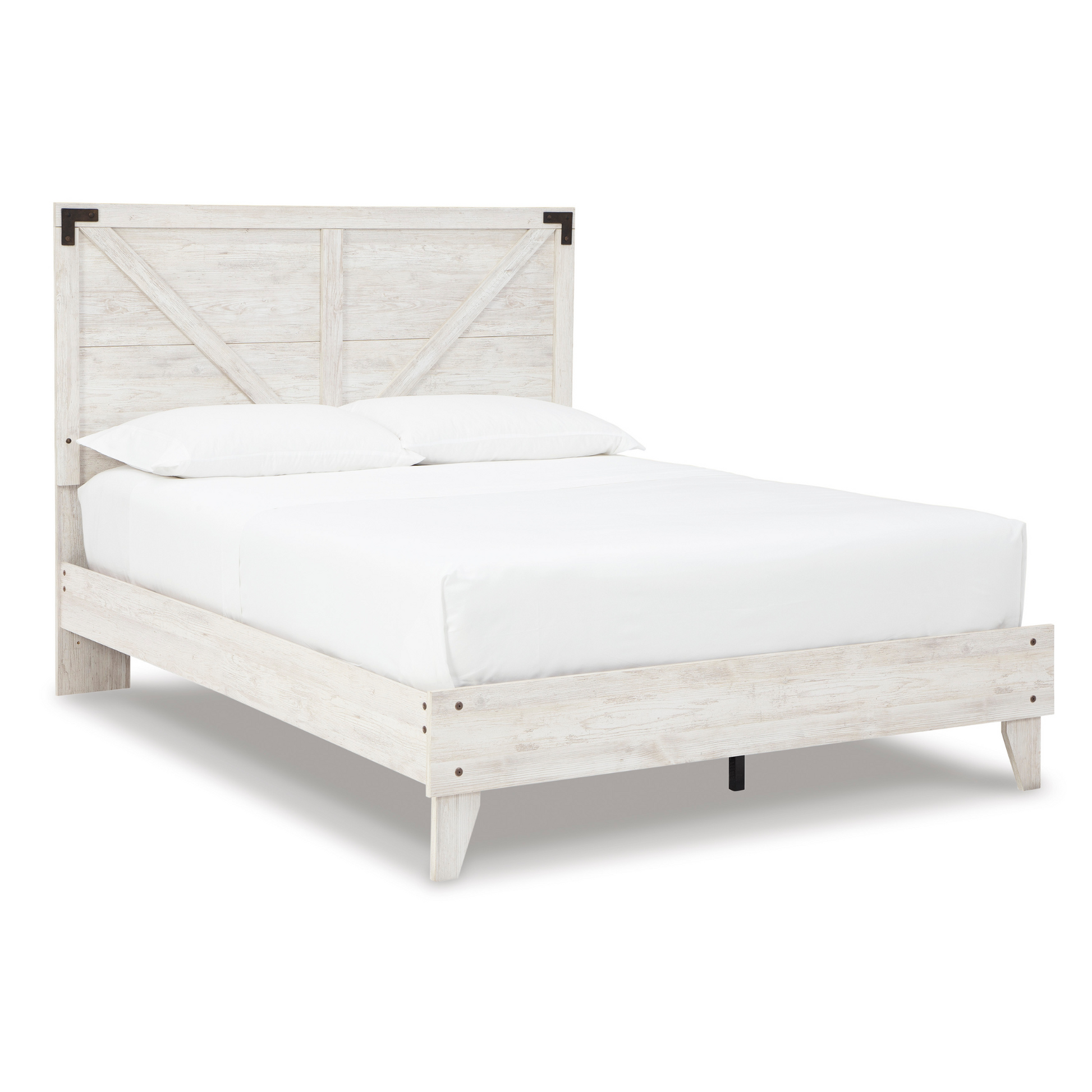 Give provincial a new meaning with the chic look of the Shawburn queen panel headboard. The white wash distressed finish keeps this piece light and fresh while the warm pewter-tone hardware adds an industrial touch. The panel headboard with crossbuck detail adds a delightfully homespun charm to your space.