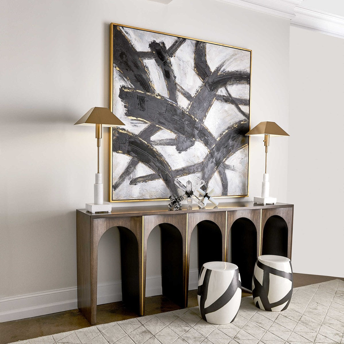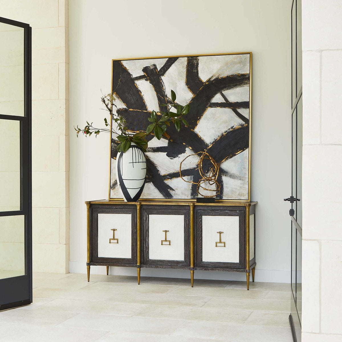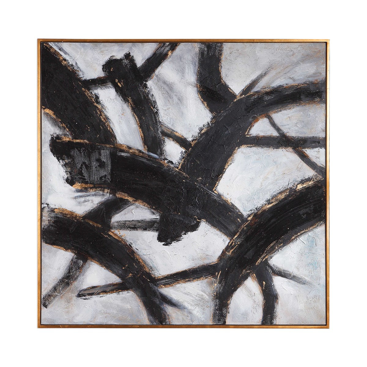 • Modern in design, this hand painted abstract on canvas is composed of large, expressive brushstrokes. Bold, black strokes are painted on a textured white background and are accented by bright, gold fleck highlights. The canvas is stretched and attached to a wooden frame. Each canvas is surrounded by a gold leaf gallery frame. Due to the handcrafted nature of this artwork, each piece may have subtle differences. This piece may be hung horizontal or vertical.