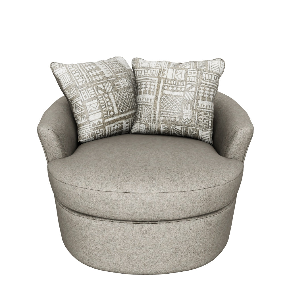 Flaunting a trendsetting silhouette, the Soletren swivel accent chair puts the contemporary in your contemporary home. Its 360-degree swivel gives you an around-the-room view to complement your comfort. Microfiber fabric satisfies your need for a piece that feels as good as it looks. Accented with soft jacquard chenille throw pillows for a splash of geometric pattern and color contrast.
