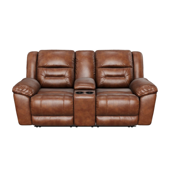 For those that love the cool look of leather but long for the warm feel of fabric, the Stoneland reclining loveseat with console delivers both with ease. Its high-performance padded faux leather is remarkably durable and easy to clean, just the thing for family spaces. Channel-stitched back cushions provide indulgent lumbar support for maximum comfort—not to mention fashion-forward flair.