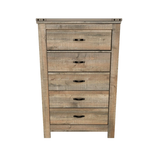 Details & OverviewWhether she loves horses or he's a cowboy at heart, the Trinell chest of drawers matches their authenticity. Rustic finish, plank-style details and nailhead trim pay homage to reclaimed barn wood, making for a chic look loaded with charm. Five roomy drawers keep clothing or toys nicely reined in.