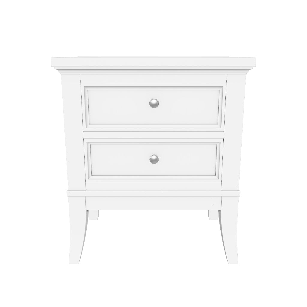 Two Drawer Night Stand,Light,Made with hardwood solids and MDF substrates;White finish;Knobs with satin nickel-tone finish;2 drawers with fully finished interior, dovetail construction and heavy duty ball-bearing side glides (top drawer felt lined);Flare legs