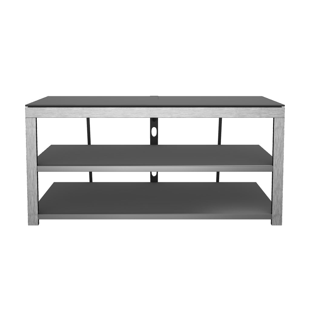 Details & OverviewFor those who appreciate open-concept design, the Rollynx TV stand is beautifully in tune. Cool and contemporary, this TV stand really steps it up with cantilever styling and a two-tone finish that blends an aged silvertone metal frame with sleek black glass shelves. A wire management support bar helps maximize the minimalism.