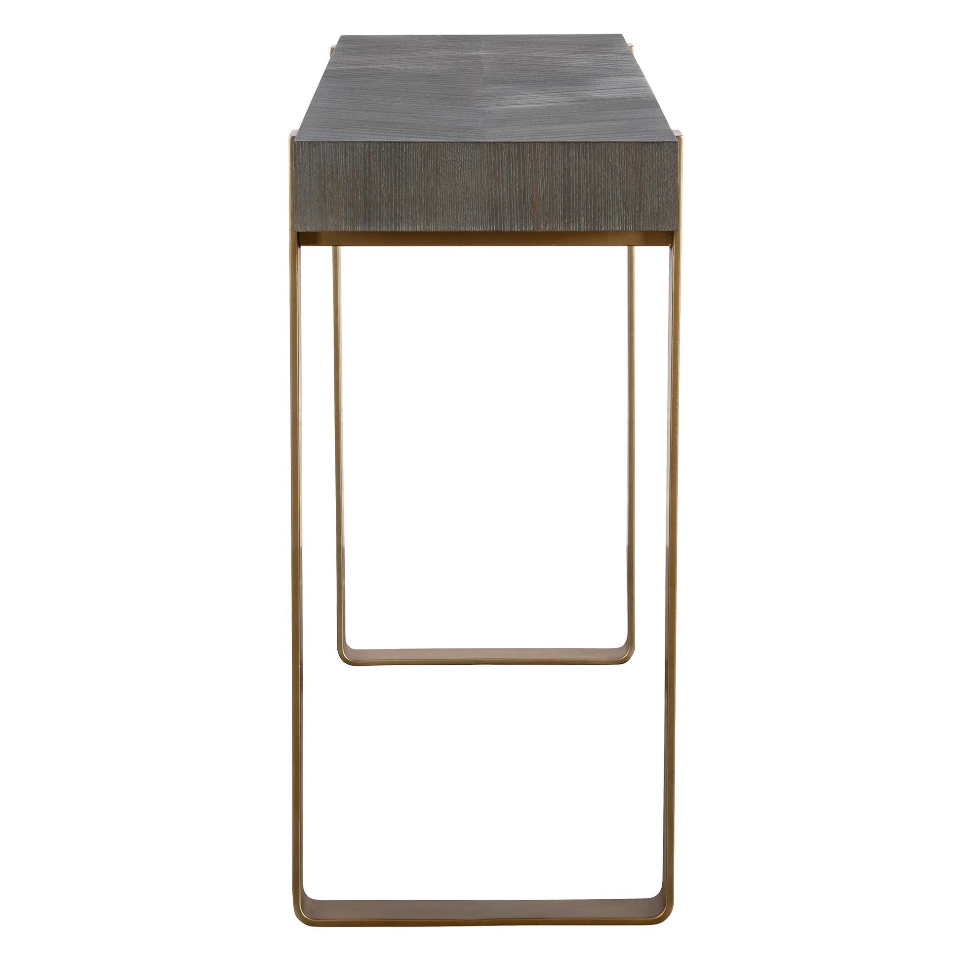 Contemporary In Style, This Console Features A Striking Diamond Ash Veneer Top In A Dark Walnut Stain With Light Gray Glazing. The Iron Strap Legs Are Finished In A Warm Brushed Brass.