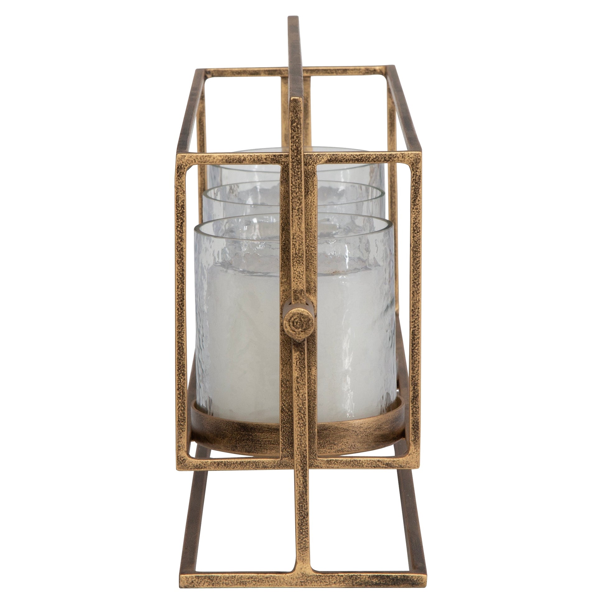 Illuminate Your Space With A Warm Glow From This Textured Glass And Iron Triple Candle Lantern. Designed To Hold Three Pillar Candles, It Features Removable Textured Clear Glass Hurricanes And Iron Stand With Antique Gold Finish. Three, White 3"x 3" Candles Is Included.