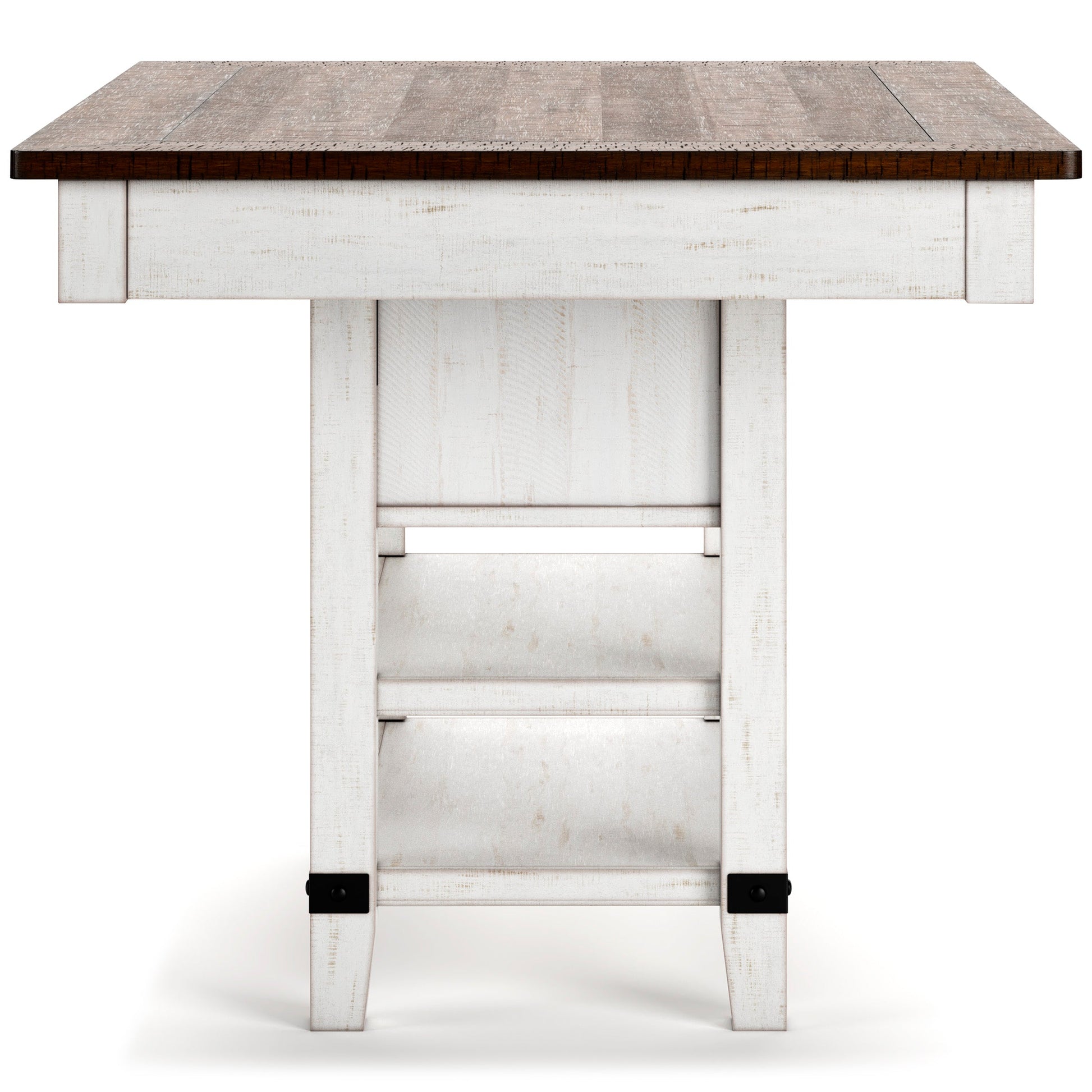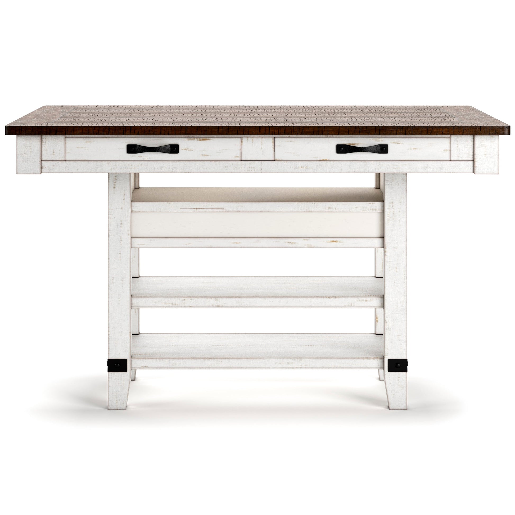 A high-style choice for dining spaces, the Valebeck counter height dining table serves up the best in rustic farmhouse living. Its two-tone finish pairs a brown tabletop with a distressed vintage white base for a double helping of charm. The table features four storage drawers (two on each side), a seven-bottle wine rack and two open shelves for display. The sturdy post and bracket base design, with black metal accents and a thick dining top, lends an earthy appeal.