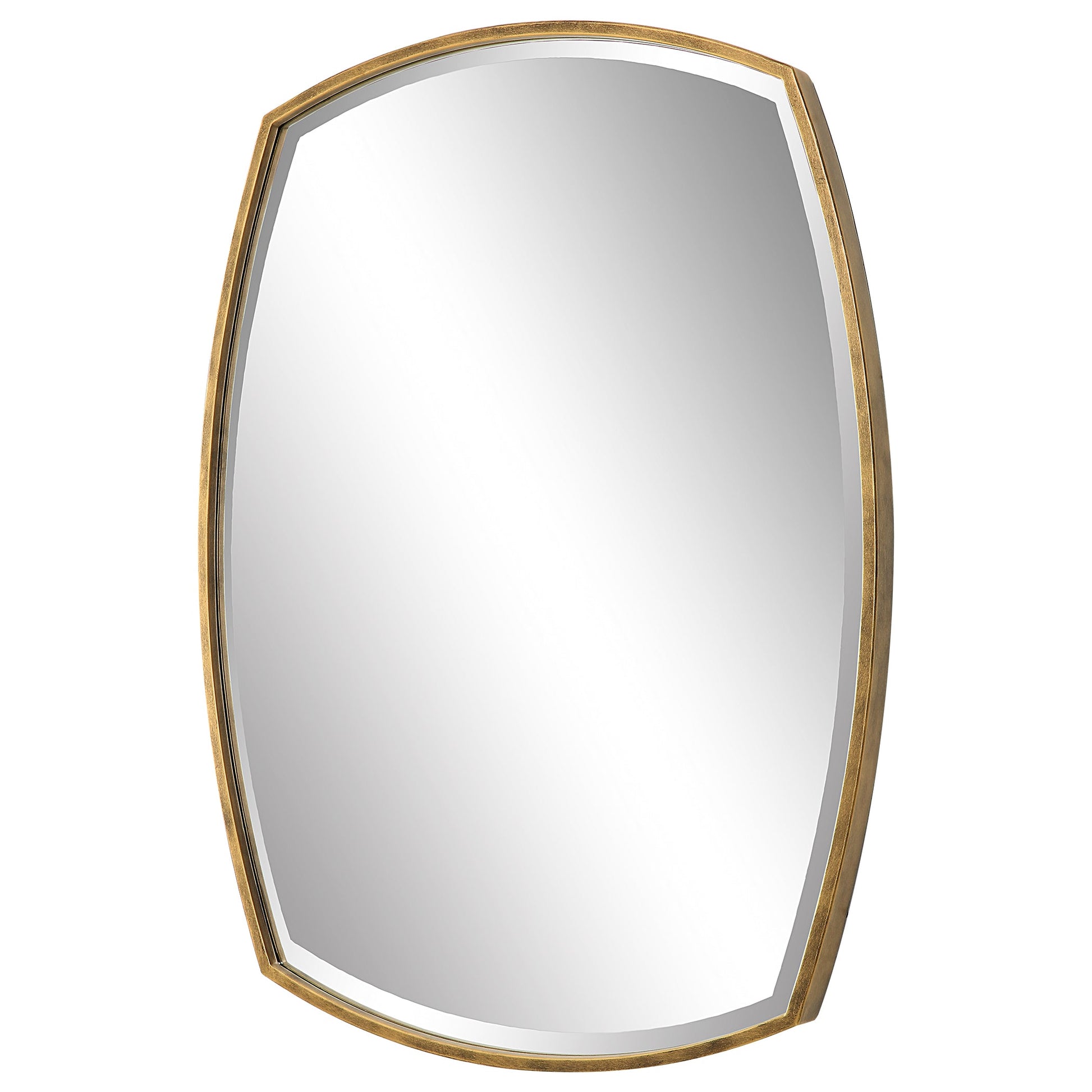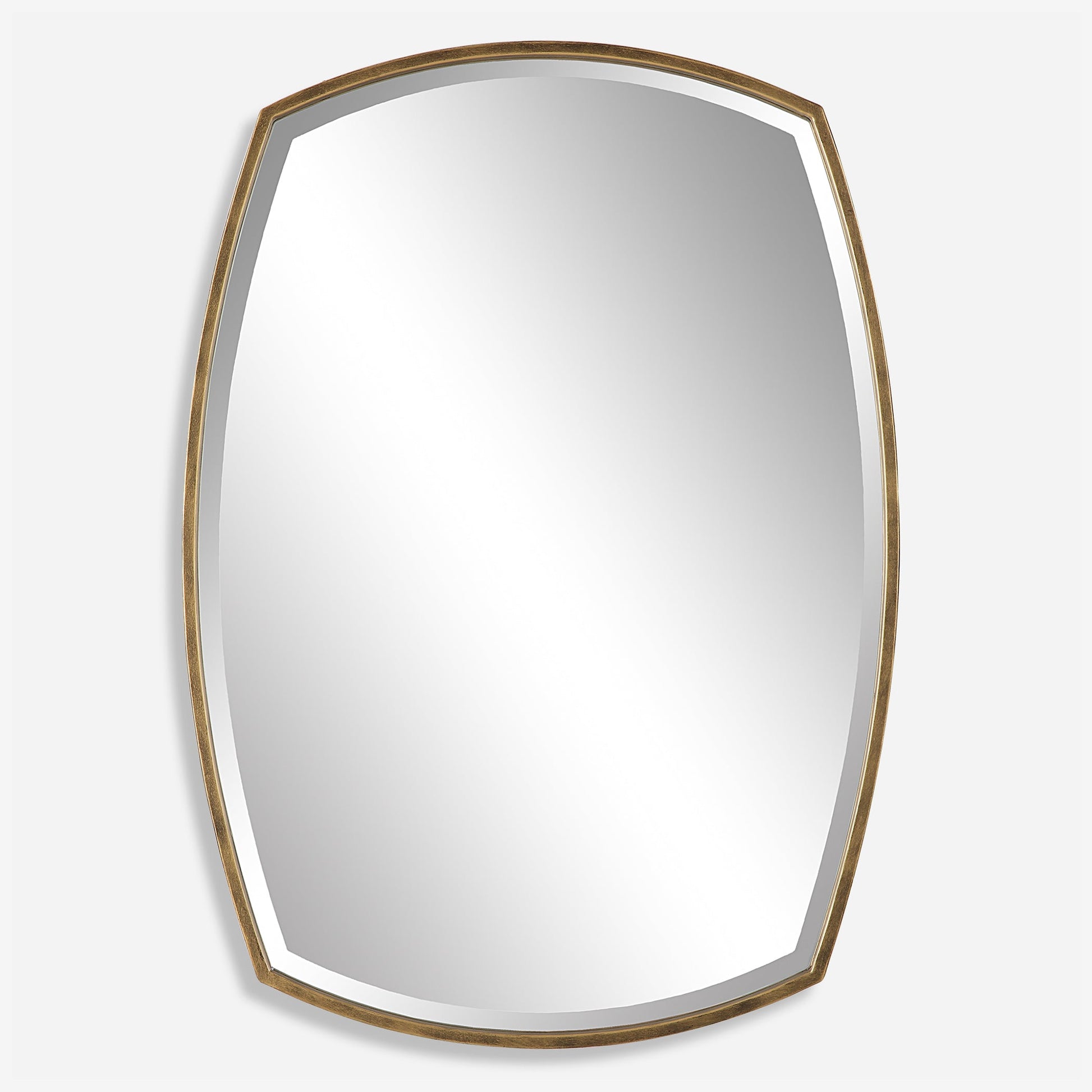 Details & OverviewThis Shapely Mirror Features An Iron Frame Finished In A Heavily Antiqued Gold With Outer Curves For An Updated Appeal To The Traditional Rectangle. Mirror Has A 1" Bevel. May Be Hung Horizontal Or Vertical.