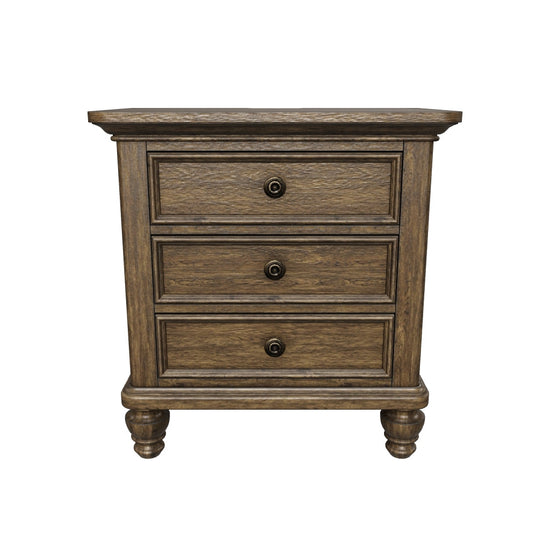 Three Drawer Night Stand,Dark,Made with hardwood solids, oak veneer and MDF substrates;Rich brown walnut finish with wood grain texture;Round metal knobs with antiqued bronze-tone finish;3 drawers with fully finished interiors, dovetail construction and heavy duty ball-bearing side glides (top drawer felt lined);110V power supply with USB-A and USB-C charging ports;Power cord included; UL Listed