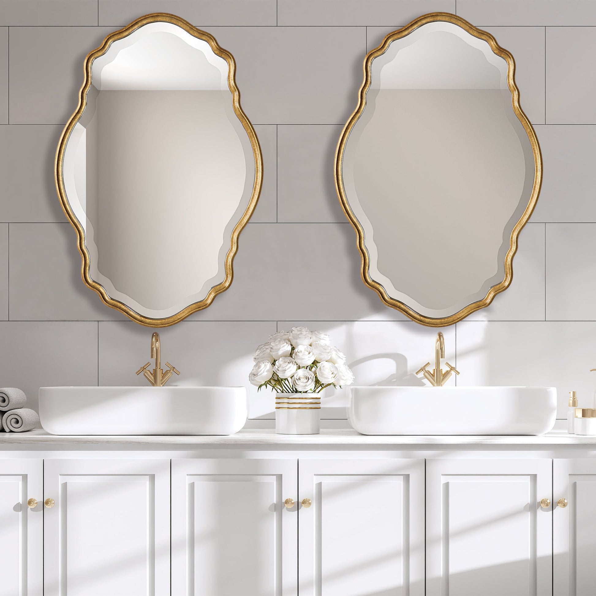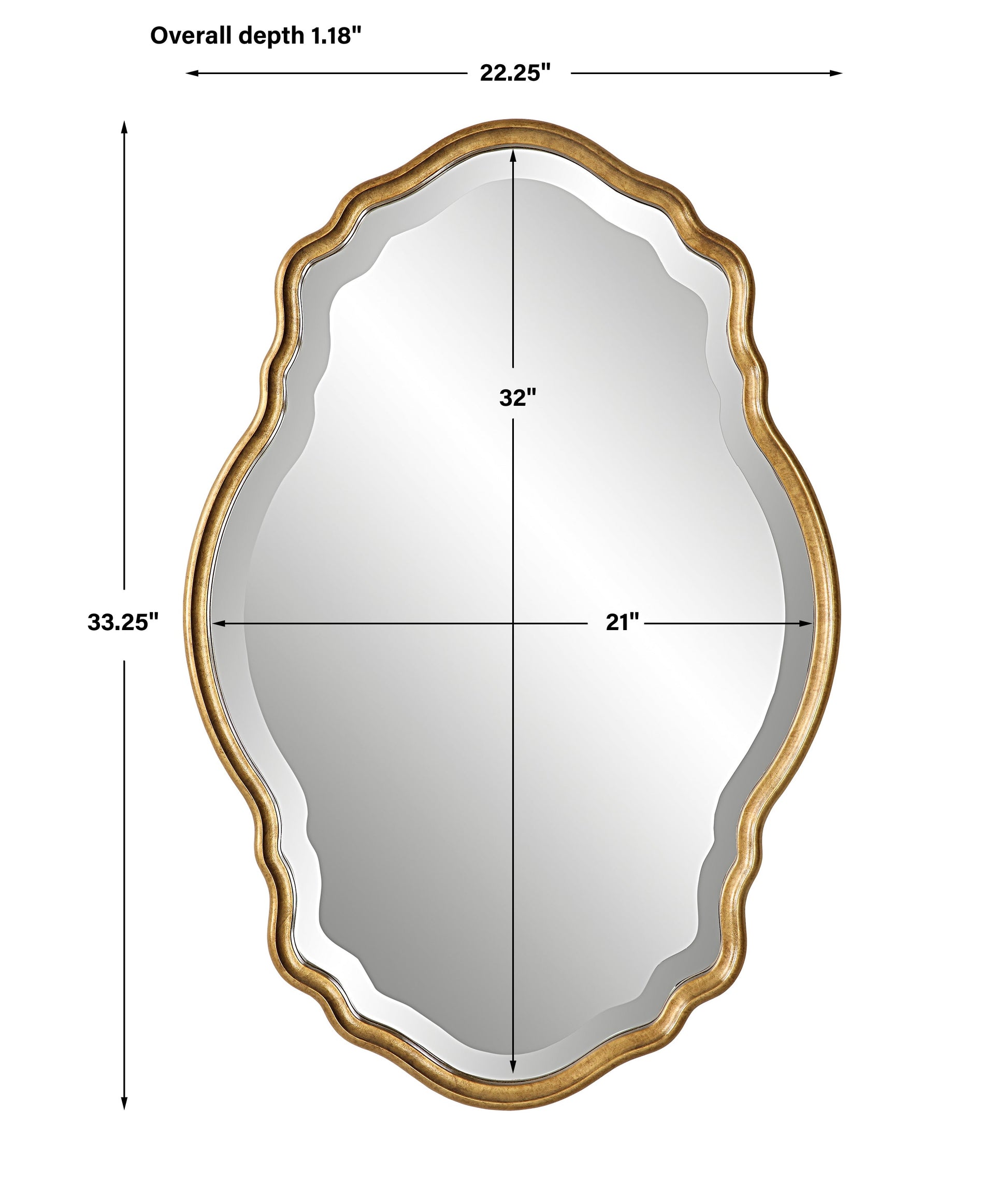 Details & OverviewGraceful curves add elegance to this unique mirror. The frame features a rich gold finish with amber glaze. The mirror has a 1.25" bevel. May be hung either vertically or horizontally. Also available in antiqued silver, W00434.