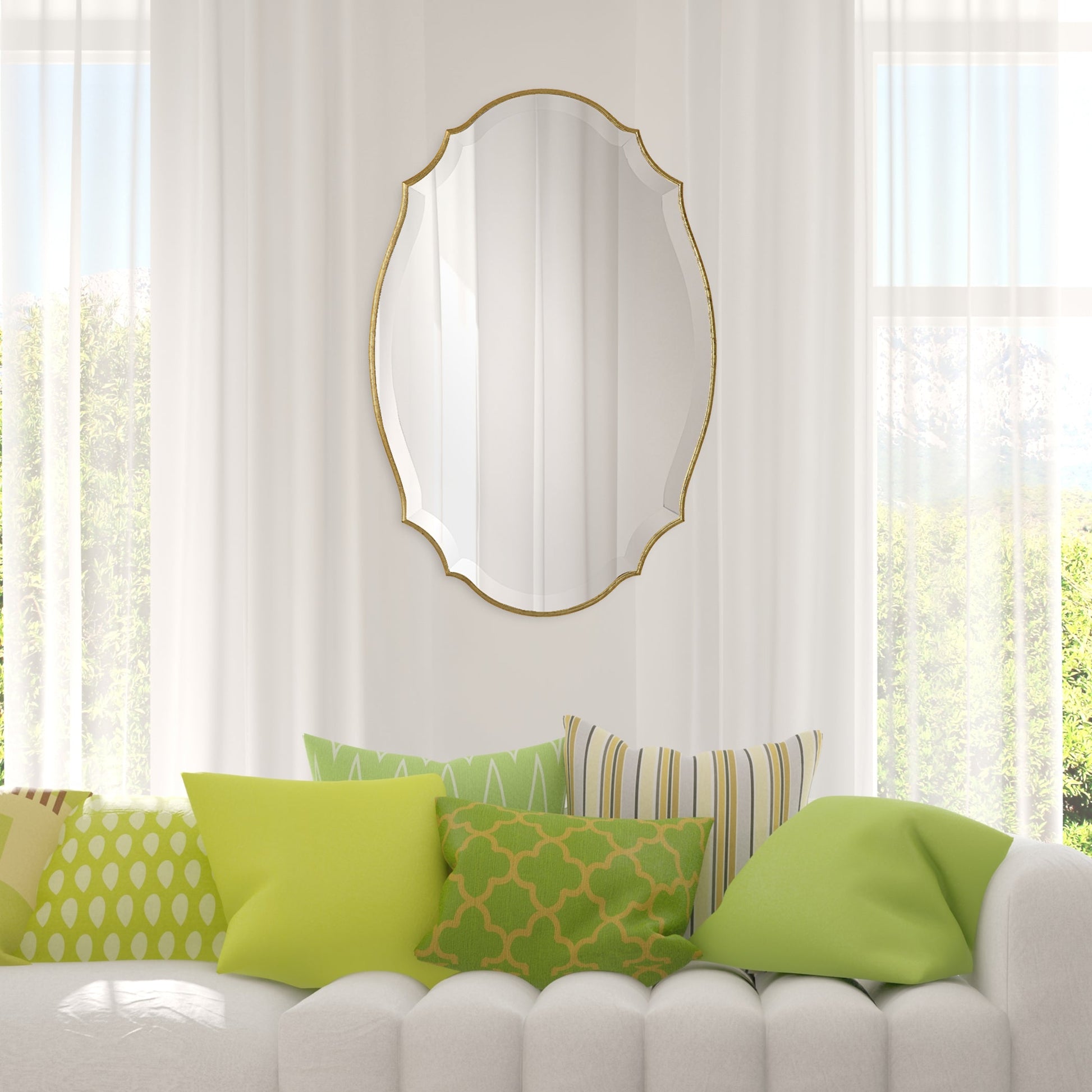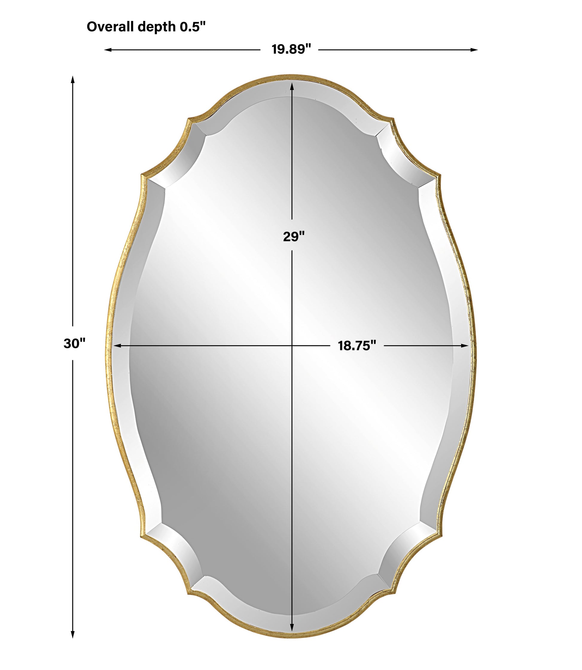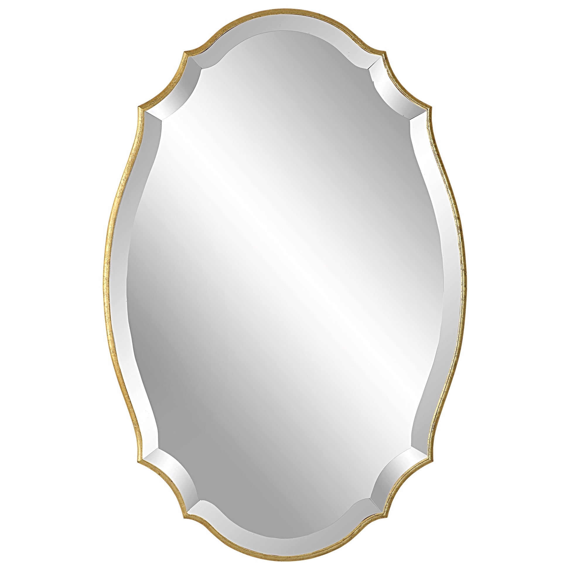 A shaped beveled mirror sits atop a rounded edged frame, finished in a lightly antiqued, metallic gold leaf. The bevel is 1" wide. This frame may be hung either vertically or horizontally. Also available in bronze, W00406.