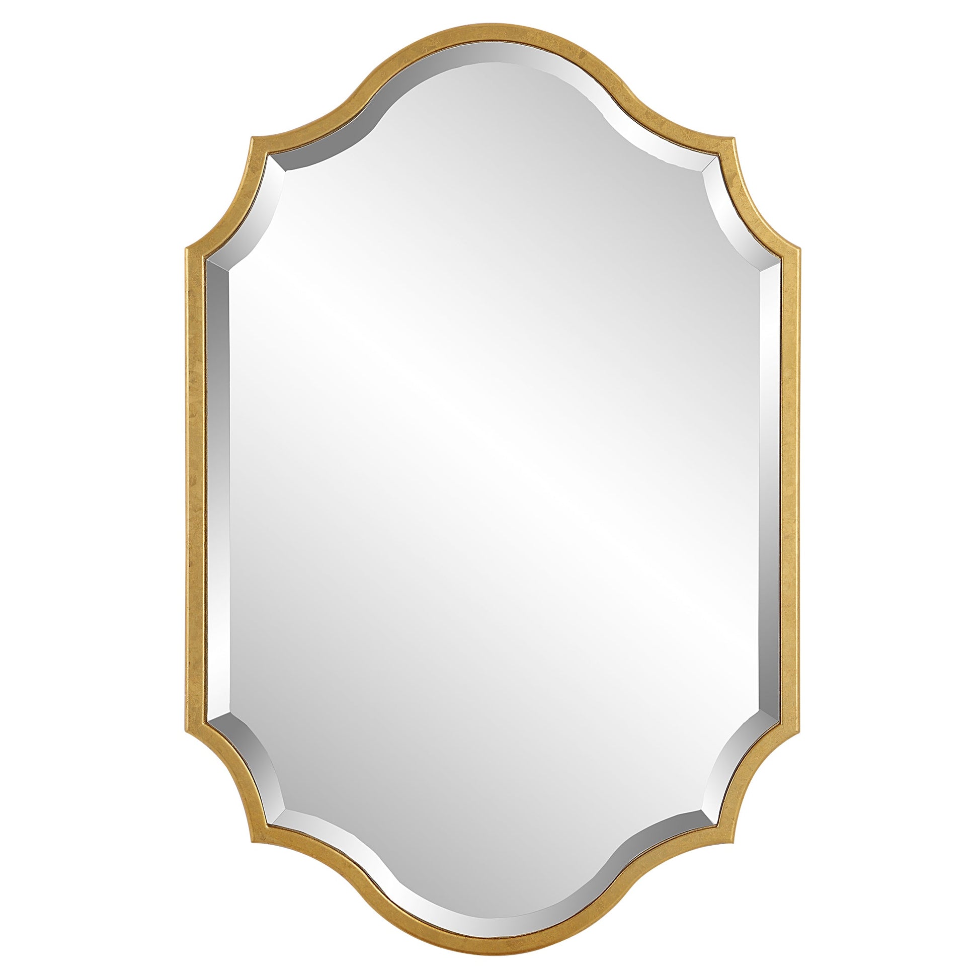 This metal frame, with its elegant curves and arches, is enhanced with a rich gold leaf finish. Perfect for a foyer to welcome your guests or give your powder room an extra touch. The mirror has a 1" bevel and can be hung either vertically or horizontally.