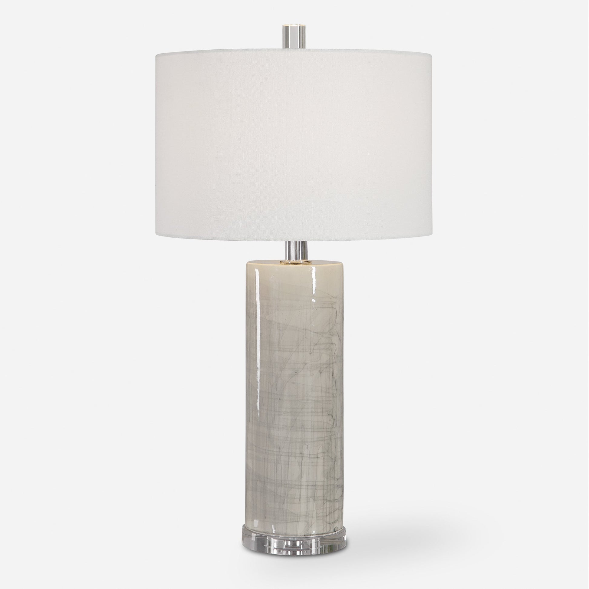 Details & OverviewModern In Design, This Ceramic Table Lamp Showcases A Neutral Beige Glaze With An Abstract Gray Drip Pattern, Paired With Elegant Crystal Details And Polished Nickel Plated Accents. The Hardback Drum Shade Is A White Linen Fabric.